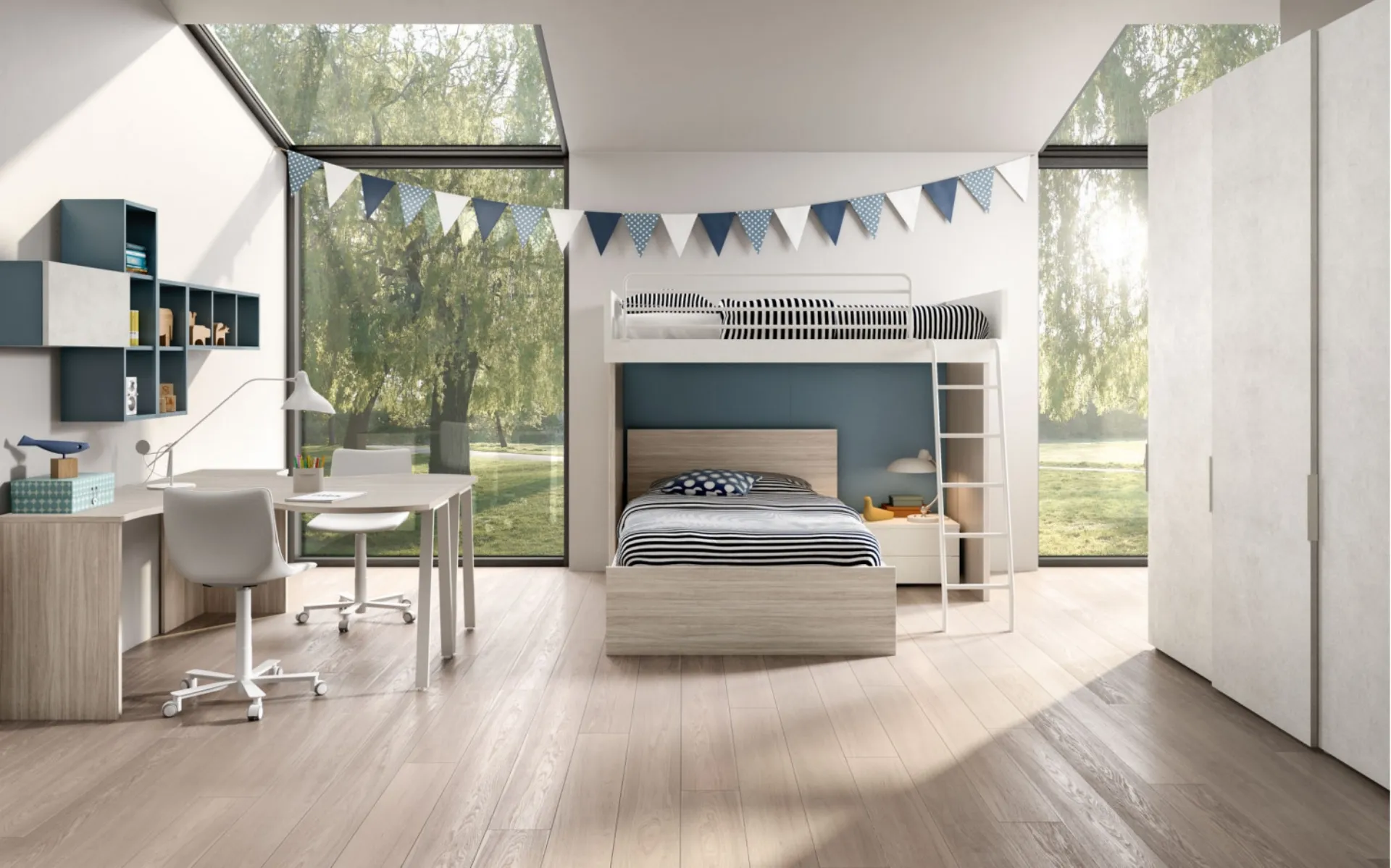 Le Camerette dei nostri figli sono lo spazio in cui cresceranno divertendosi e sognando, perciò è imprescindibile che lo spazio sia agevole. I nostri bambini trascorrono gran parte della giornata nelle loro camere da letto: rendile adatte per studiare, giocare e riposare ogni giorno. Con la Camera con soppalco Room 154 di Zg Mobili in melaminico ti assicurerai un perfetto connubio di ergonomia e sicurezza, ideale per la stanza dei tuoi figli. Presentiamo nel nostro showroom diverse Camerette a soppalco moderne per ragazzi del marchio, ideali per accompagnarli durante il loro sviluppo.