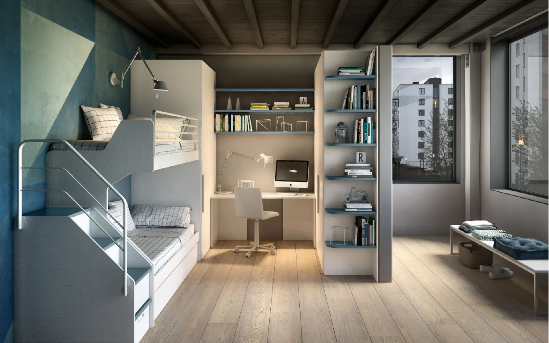 Se la stanza ha misure non generose, sono diverse le soluzioni che Zg Mobili presenta, sempre capaci di unire ergonomia e sicurezza. Le Camerette a soppalco per ragazzi del noto e conosciuto brand sono disponibili in diverse versioni, che rispondono sempre alle necessità dei bimbi. Gli accessori disponibili per le Camerette a soppalco di Zg Mobili sono sempre personalizzabili, per scongiurare qualsiasi problema di spazio e funzionalità. Scopri nel nostro showroom la Camera con soppalco Room 170 di Zg Mobili in melaminico: è ideale per ricreare alla perfezione un ambiente ideale per i bambini, bello e ben organizzato.