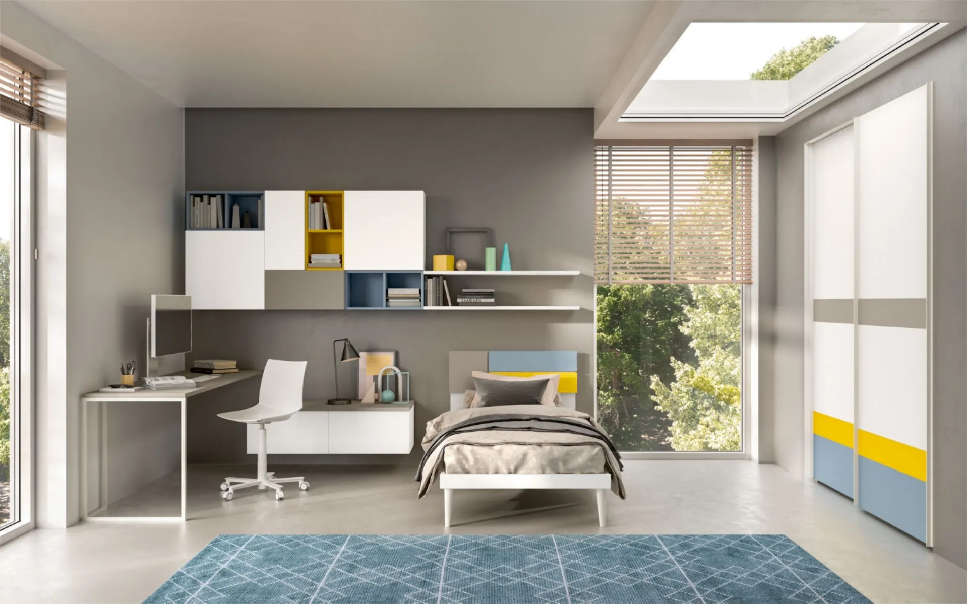 Se cerchi idee creative per decorare perfettamente la stanza dei tuoi figli, ti presentiamo la Cameretta Room 122 di Zg Mobili con finitura in melaminico. Zg Mobili dispone di una ricca gamma di elementi accessori da comporre su misura: troverai letto, armadio, scrivania, sedie e librerie. Questa proposta in melaminico ultima perfettamente le doti di funzionalità e il valore estetico della camaretta, in quanto è capace di unire funzionalità ed ergonomia. Porta contenuto estetico e cromie vivaci nella stanza dedicata ai bambini con questa proposta, una delle Camerette componibili per ragazzi di Zg Mobili.